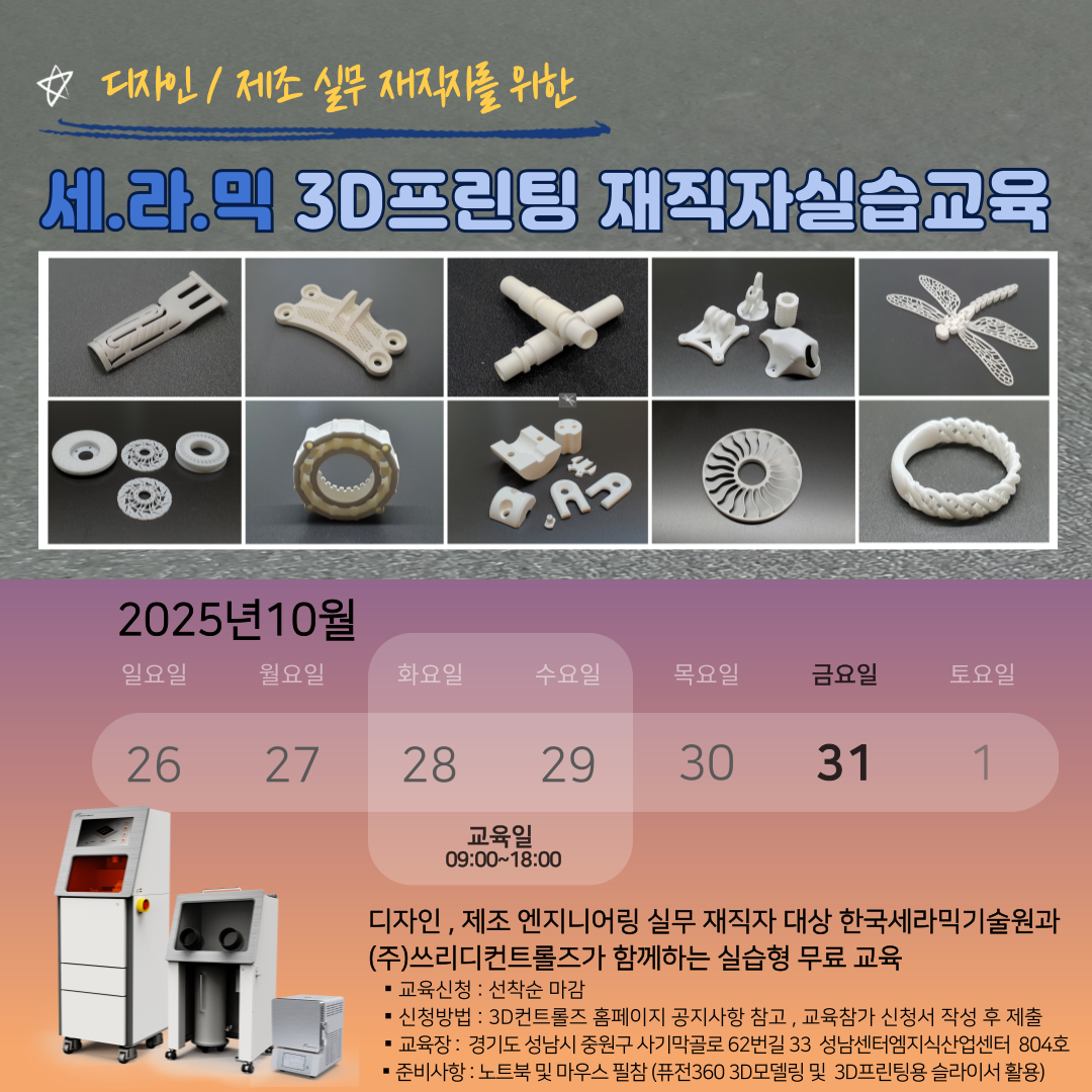 오는 10월 28~29일 한국세라믹기술원·3D컨트롤즈가 진행하는 ‘세라믹 소재 활용 3D프린팅 운용 실무' 재직자 무료 교육을 안내드립니다.