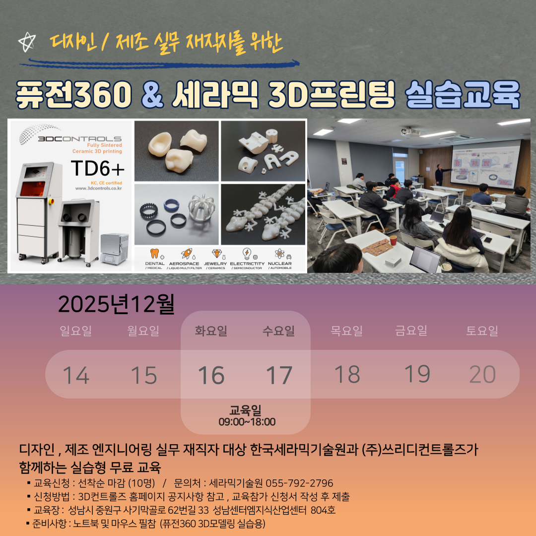 12/16(화)~17일(수) 양일간 3D프린팅을 위한 퓨전 360 설치 및 인터페이스 이해부터 3D모델링 생성의 기초 과정과 세라믹 3D프린팅 장비 운용, 소결·연마 등 후공정 실습까지 진행됩니다.